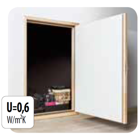 De sterk isolerende DWT knieschotdeur heeft een dikte van 6,6 cm en biedt een uitstekende thermische isolatie (U =0,6 W/m²K*) en goede luchtdichtheid, waardoor het warmteverlies beperkt wordt. De knieschotdeur kan worden gemonteerd zowel naar rechts of naar links opendraaiend. De deur wordt standaard geleverd met afdeklatten.